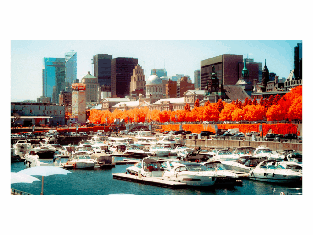 Later I walked through the historic port. The mix of old warehouses, wide quays, and the St. Lawrence River gave the area a strong character. Seen through my infrared camera it looked almost surreal, with bright glowing trees against the stone buildings and the water.